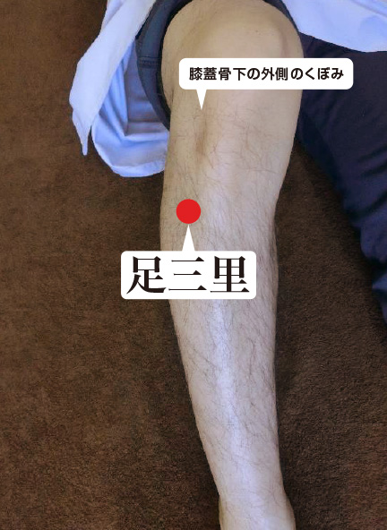 「今月のツボ」で度々紹介している、膝を立てて出来る膝蓋骨下の外側のくぼみから指4本分下にある「足三里(あしさんり)」です。